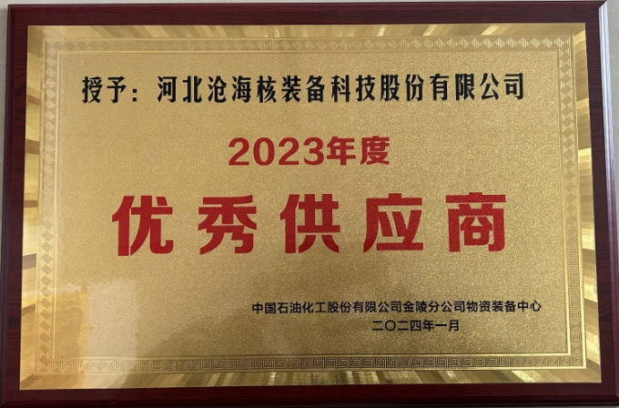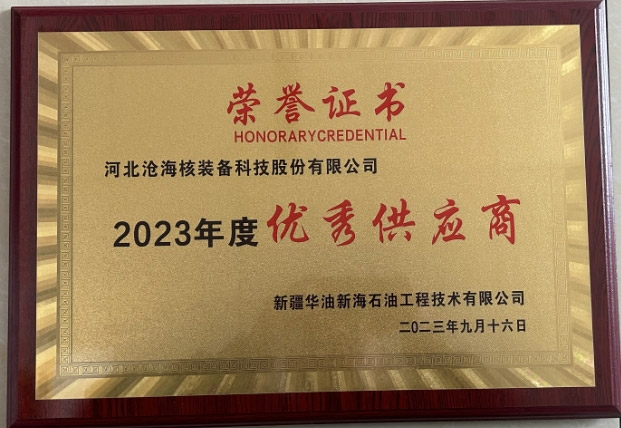 近日,河北滄海核裝備科技股份有限公司先后榮獲2023年度中國石油化工股份有限公司金陵分公司物資裝備中心、新疆華油新海石油工程技術(shù)有限公司頒發(fā)的“優(yōu) 秀供應(yīng)商”榮譽(yù)稱號,為公司榮譽(yù)墻再添新彩。